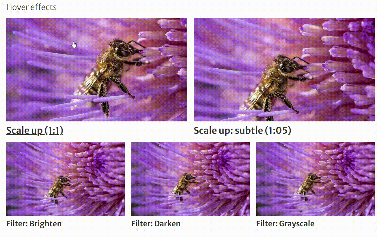 Select between image scale up effects or add greyscale, dark or light filters. You will find the hover options in the article teaser menu for media options.
